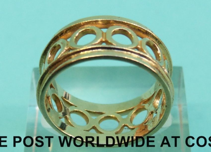 A 9ct gold ring with pierced circular design (Size O, 5g)