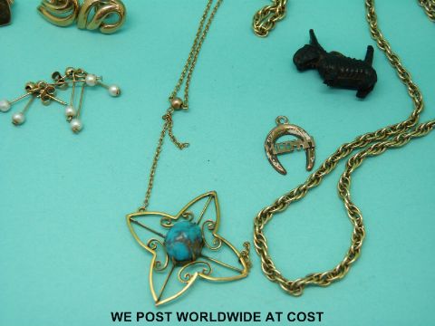 A 9ct gold necklace, a yellow metal pendant set with turquoise marked 9ct to the clasp and two pairs of 9ct gold earrings (14g) etc