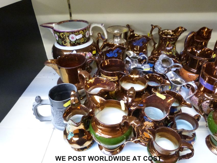 A very large collection of Victorian and early 20thC copper lustre ware jugs and vessels including hand decorated relief moulded and transfer printed