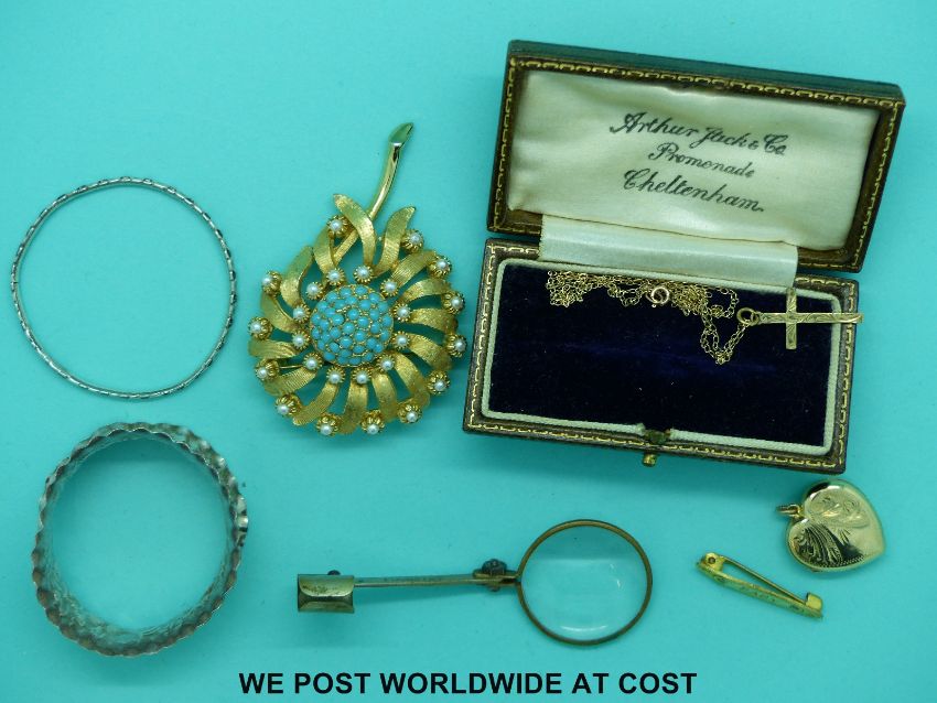 A silver napkin ring, silver christening bangle, 9ct gold cross and chain, Cheltenham jewellery box etc