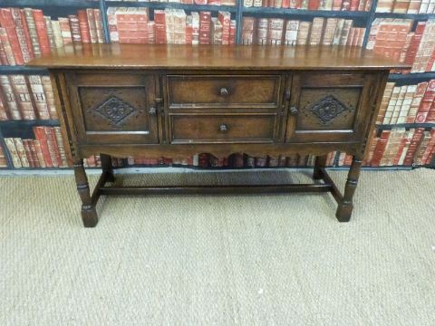 A 19th/20thC carved oak low sideboard or dresser base with two drawers flanked by two cupboards and shaped apron (H82 x W153 x D50cm)