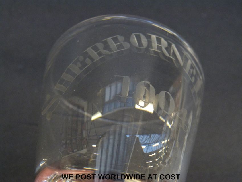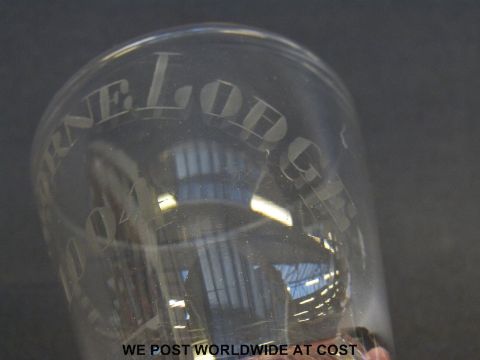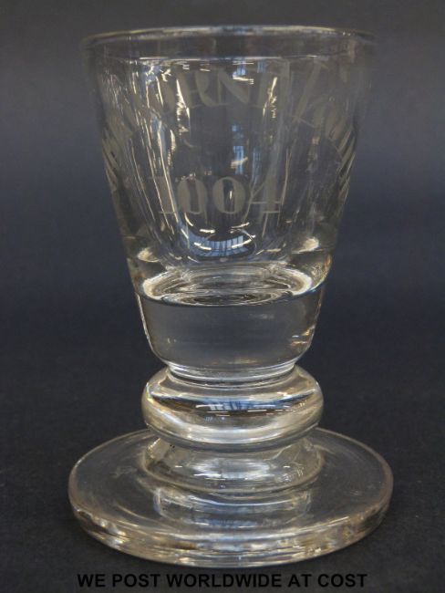A Georgian firing glass with tapered bucket bowl engraved 'Sherbourne Lodge 1004' raised on a thick foot (10cm tall) together with a similar Georgian drinking glass.