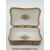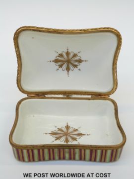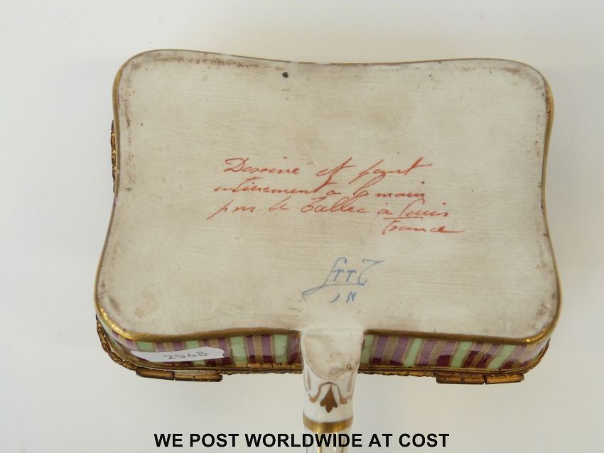 A French ceramic sweetmeat serving box with hinged lid and handle decorated in green, red and gilt and French script to base (12 x 9cm)