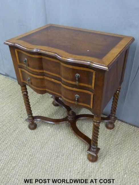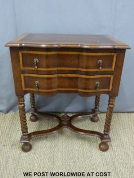 A continental breakfront chest of two drawers raised on barley twist legs united by shaped stretcher (H76 x W65 x D44cm)