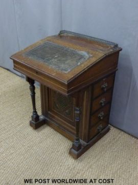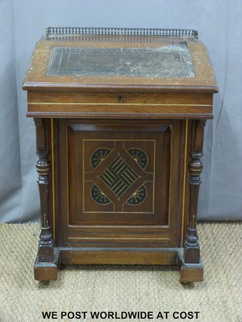 A 19thC Davenport with hinged writing slope and top panel, the base fitted four drawers to one side and four false drawers to the other, decorated in Aesthetic style (W53 x D52 x H77cm)