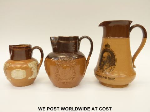 Two Doulton Lambeth King Edward VII 1902 coronation jugs and a King George V example (tallest 20cm)