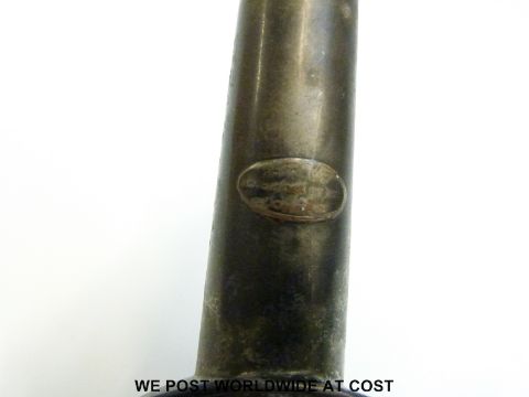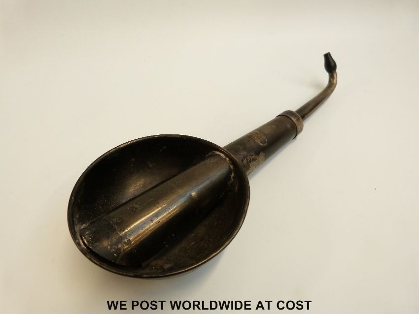 A late 19th / early 20thC metal ear trumpet hearing aid with extending main arm, with London makers plaque (rubbed), max length 43cm