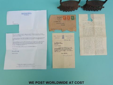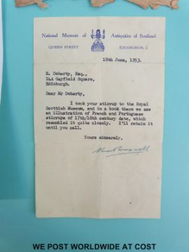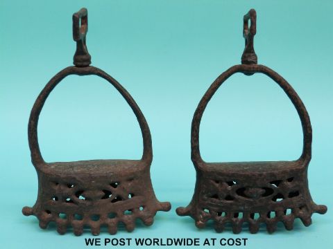 A pair of 17th/18thC Spanish or Portuguese pierced iron stirrups with various correspondence from the National Museum of Antiquities of Scotland, family letter and Sotheby's valuations circa 2000