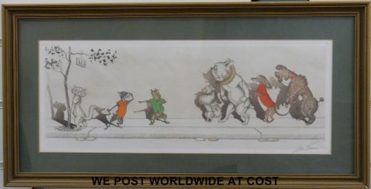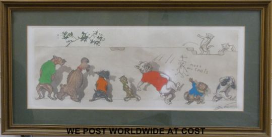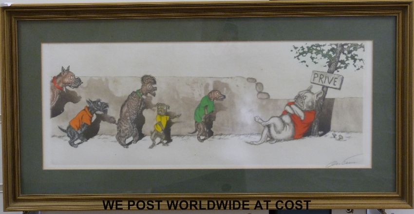 Boris O'Klein set of 12 signed humorous dog prints, all in gilt frames (each 18x45cm)