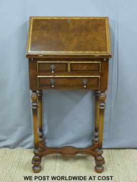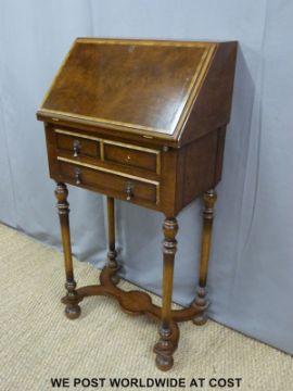 A mahogany continental style bureau with crossbanded detail, fall flap and fitted interior over three drawers raised on turned legs united by a shaped stretcher (H110 x W57 x D40cm)