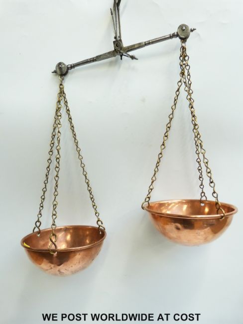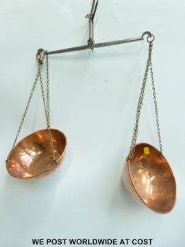 Two sets of travelling beam scales with copper pans