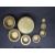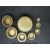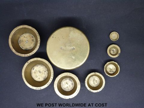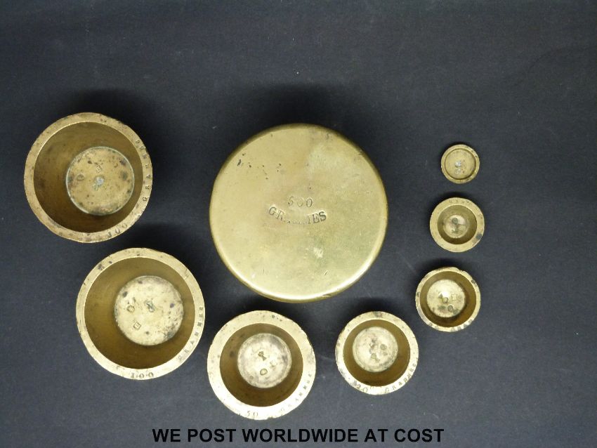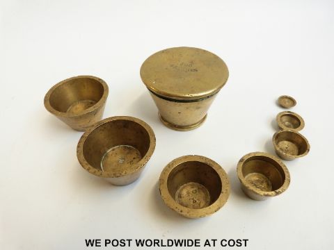 A run of brass nesting cup weights, the lid marked 500 grammes to outside and 200 grammes to inside, with A and crown above