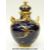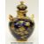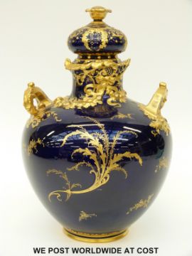 Royal Crown Derby twin handled lidded pedestal vase with gilded decoration on a navy blue ground (30cm tall)
