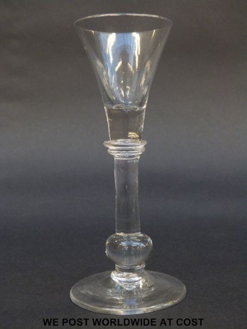 George II drinking glass with trumpet bowl over annular knopped baluster stem and lower swollen knop raised on plain foot, c1740, 15.3cm tall.