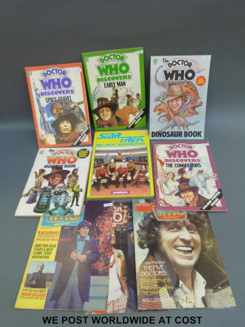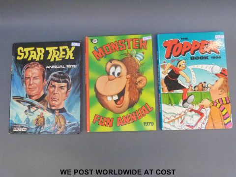 A mixed collection of annuals to include Sooty's Third Annual, Countdown, Star Trek 1972, TV 21 1973 and T.V. comic together with copies of Doctor Who monthly magazines, Beano, Dandy etc.