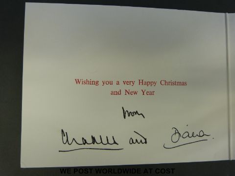 HRH Charles, Prince of Wales and HRH Diana, Princess of Wales, hand signed and inscribed 1987 Christmas greetings card with a 14x10cm colour photo of Charles, Diana, William and Harry and two embossed gold crests to the front, in original envelope with ERII and Buckingham Palace stamps.