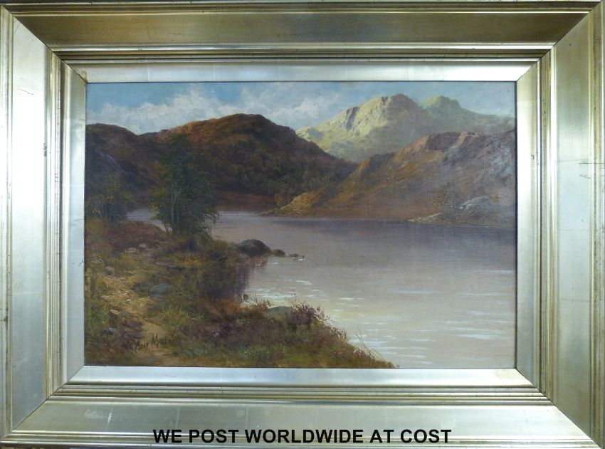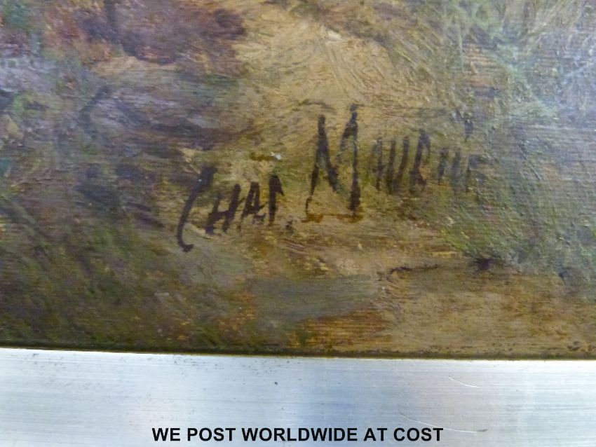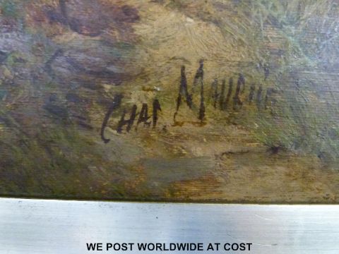 Charles Maurice oil on canvas of a mountain and lake scene, in large silver frame (40x60cm)