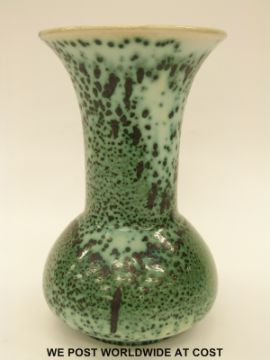 Ruskin Pottery high-fired green or aqua flambé vase of bulbous and flared form, with Ruskin, West Smethwick & 1907 date marks to base (24cm tall)