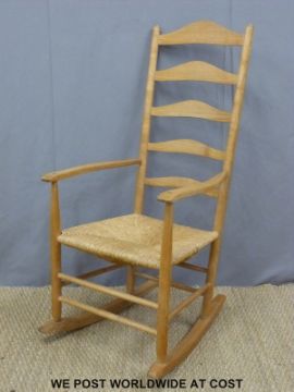 An Arts and Crafts Neville Neal rush seated peg jointed ash ladder back rocking chair
