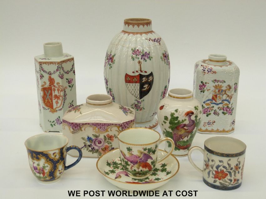A collection of 19thC Samson tea caddies, tea ware, armorial vase etc