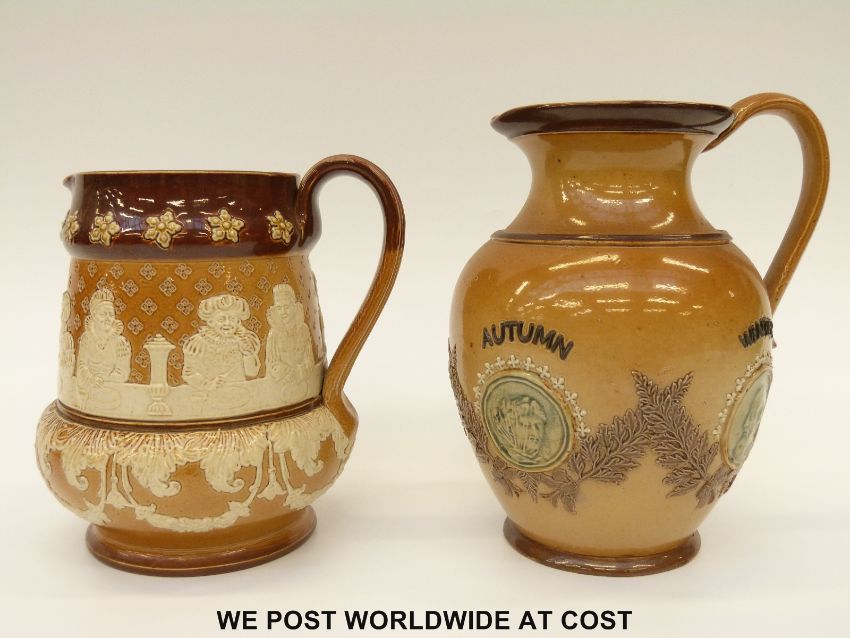 Two Doulton Lambeth salt glazed jugs, one allegorical of the four seasons, the other with an unusual relief moulded Elizabethan banqueting scene (tallest 18.5cm)