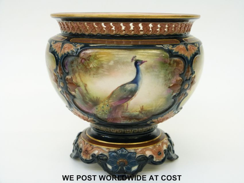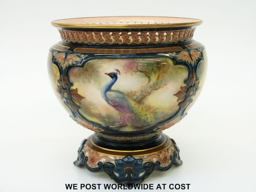 Hadley's Worcester pedestal bowl decorated with peacocks (15cm tall, 17cm diameter)