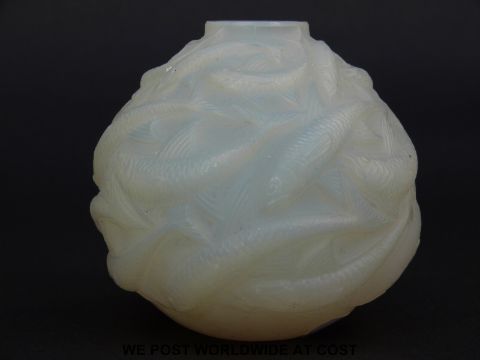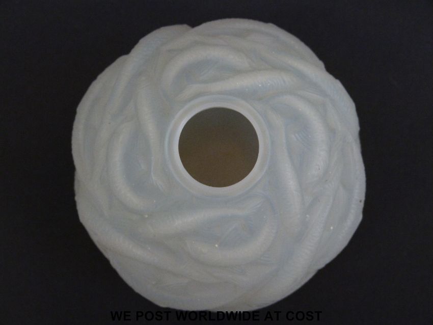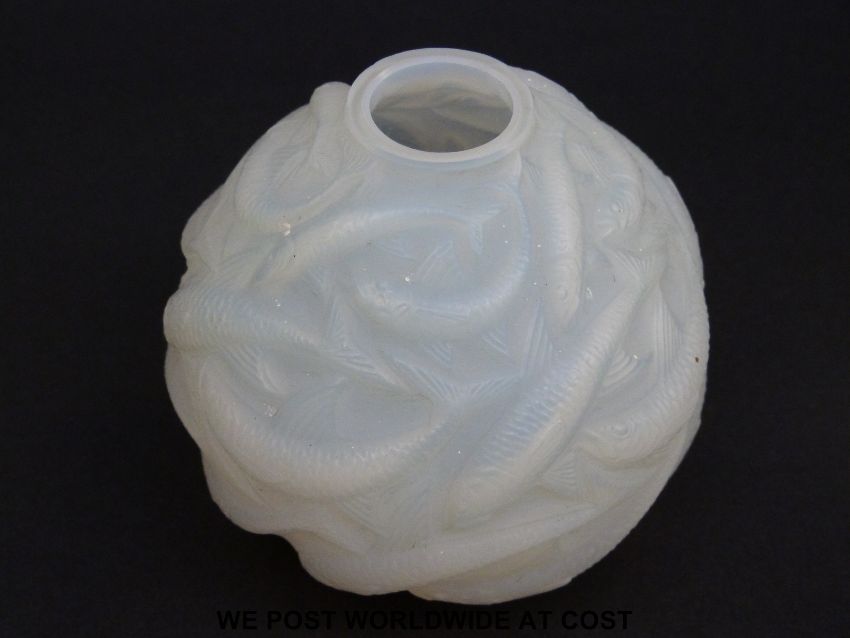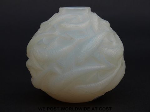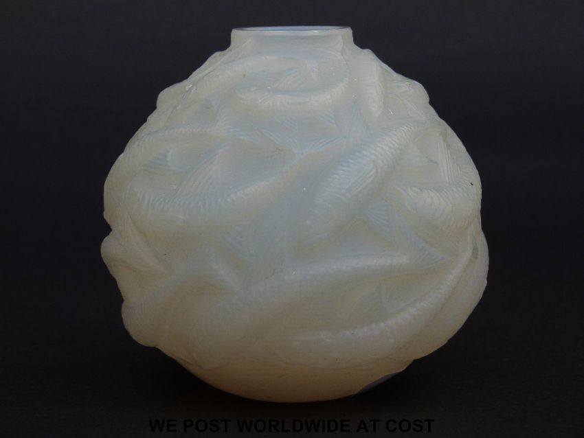 Lalique Formose vase of globular form relief decorated with swimming fish and stained in blue, no.934, signed to base R Lalique France, 9cm tall.