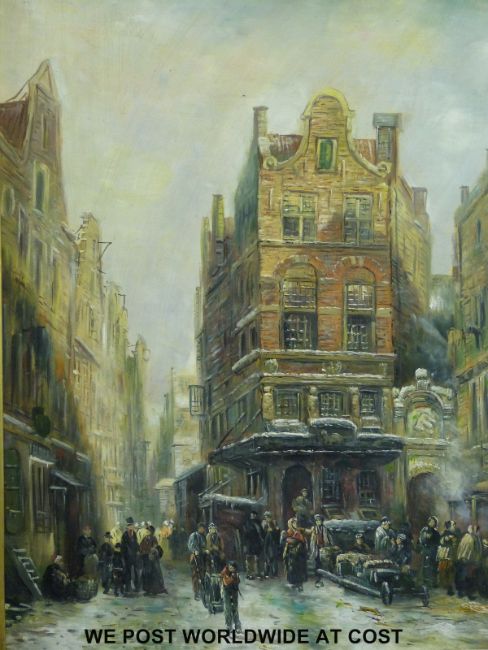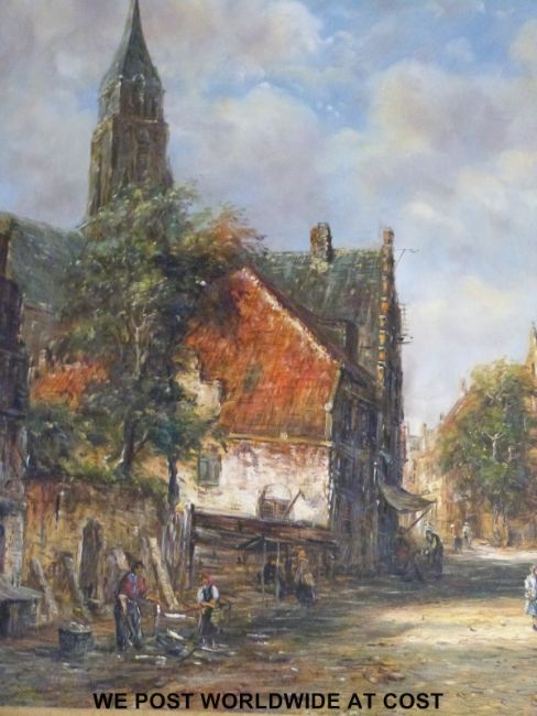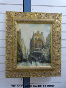 Pair of oils on board of 19th century continental streets scenes, in ornate gilt frames, indistinctly signed (50 x 38cm)