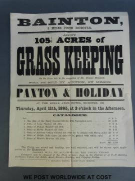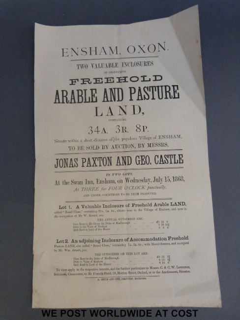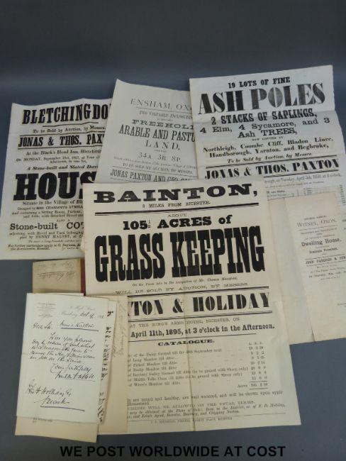 A quantity of mostly 19thC small format posters relating to auctions in Oxfordshire including Greenchurch, Whitney, Woodstock, Ensham, Bletchingdon, Home Farm Bucknell catalogue, Banbury 1883 catalogue, auction receipts etc.
