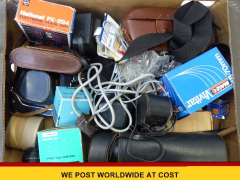 A quantity of cameras and camera equipment including Praktica BMS with accessories, Prina Galaxy lens 300mm, vintage Ensign, Kodak, Agfa, Praktica novel and super TL, Zeiss Nettar, Hanimar and Vivitar lenses, Voigtländer projector etc