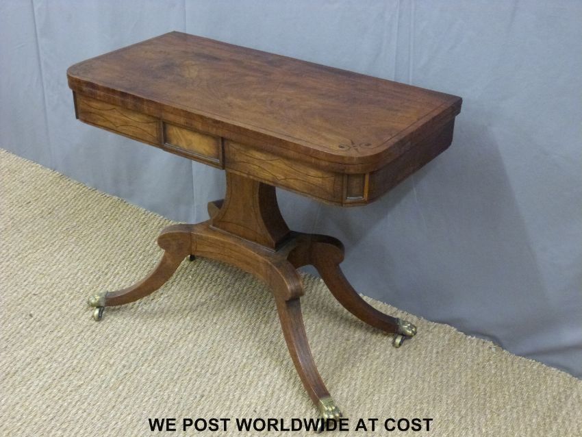 A 19thC line inlaid mahogany fold over card table on a moulded support raised on a quatrefoil base and brass castors (H70 x W89 x D44cm)