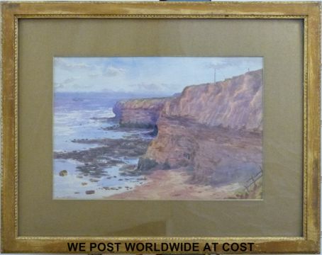 Harriet Skidmore watercolour white sands cliff, Yorkshire in gilt frame (24x35cm) together with John Moore watercolour river valley with castle above and lake scene (28x39cm)