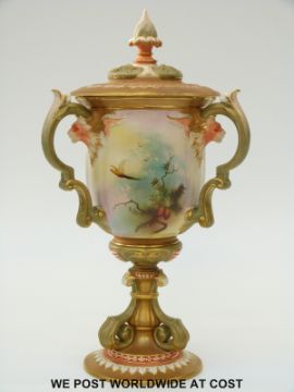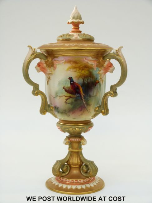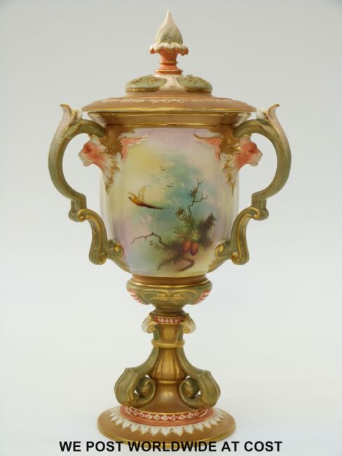 Royal Worcester Hadley pedestal covered tyg pot pourri hand decorated with pheasant scenes (29cm tall)