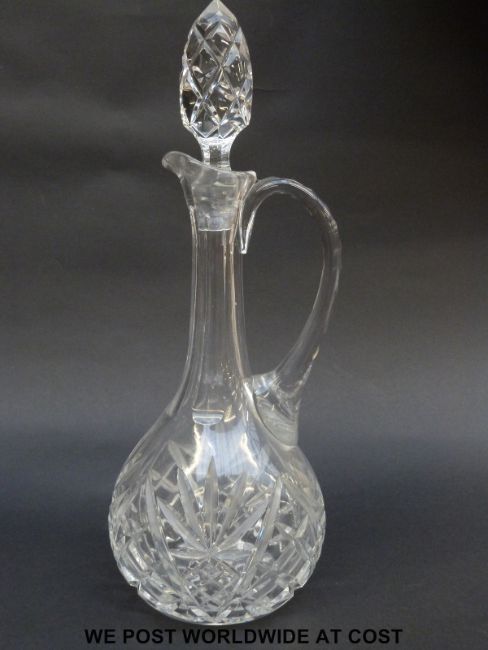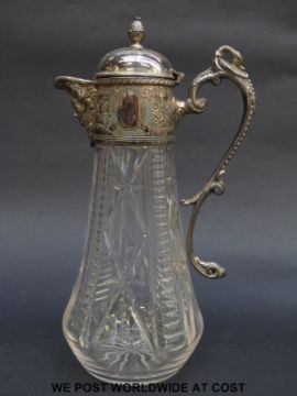 A cut glass silver plate mounted claret jug c1880 together with a Georgian rinsing bowl, George VI & Queen Elizabeth 1937 silver wedding decanter and a cut glass ewer.