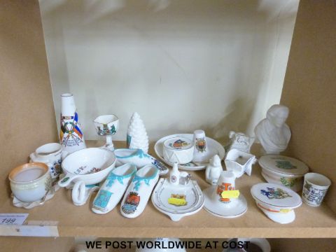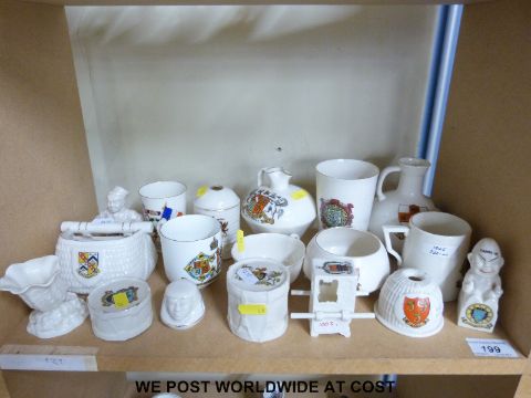 Forty pieces of crested china to include Goss, Arcadian China and some unmarked examples; Goss Flag of the Allies cup, Arcadian whisky bowl, Goss 'Thumbs Up' figure for Uckfield, Goss Roman ewer found at Arundel with matching crest etc
