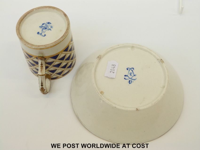 An unusual cup and saucer with bird decoration and blue and gilt geometric design, Sevres mark to base