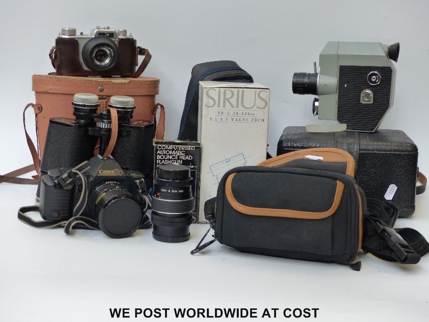 Canon T70 camera with 35-70mm lens in case, a further case with Hanimar 1:3.5 135mm lens, Vesper 10x50 cased binoculars, a vintage AKA Rette camera, boxed Sirius macro f 3.5-5.3 28-200mm zoom lens