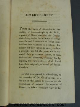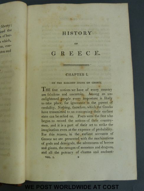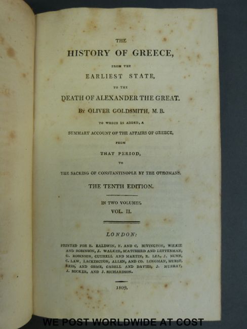 The History of Greece (London 1809) in two volumes, together with The History of Rome in two volumes by Oliver Goldsmith. Both sets uniformly bound in 19thC polished tree calf with gilt spines