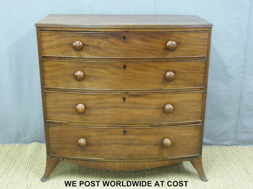 A 19thC mahogany bow front chest of two over three graduated drawers with shaped apron raised on splayed feet (H105 x W105 x D51cm)