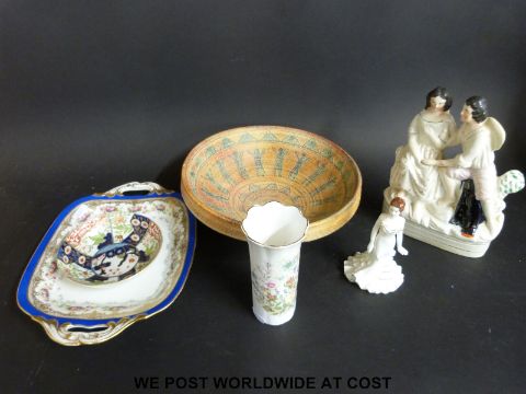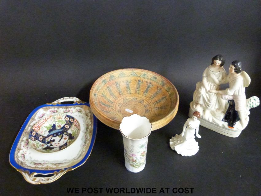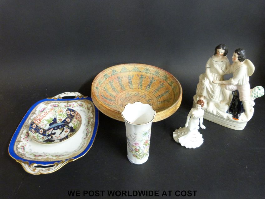 A Staffordshire figure, Coalport figurine, 18thC Imari saucer, twin handled tray etc