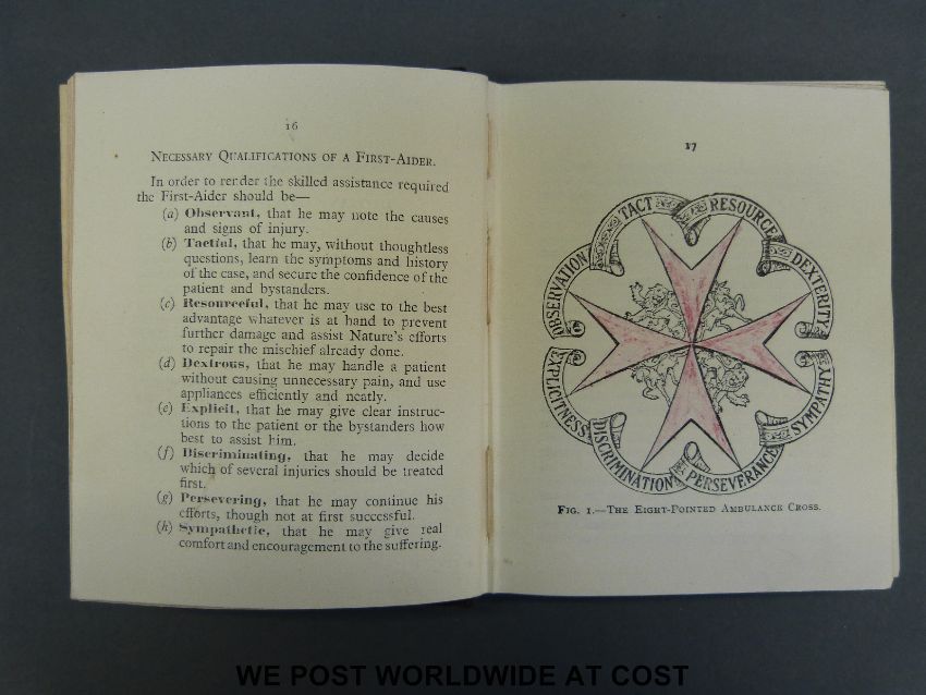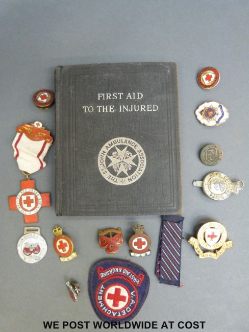 A collection of British Red Cross Society badges and medals and a First Aid book