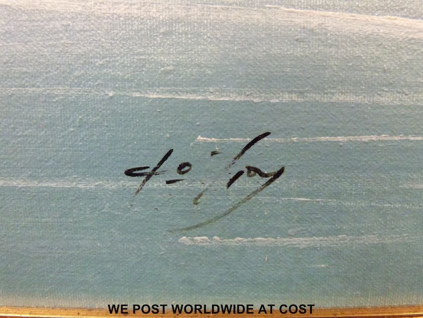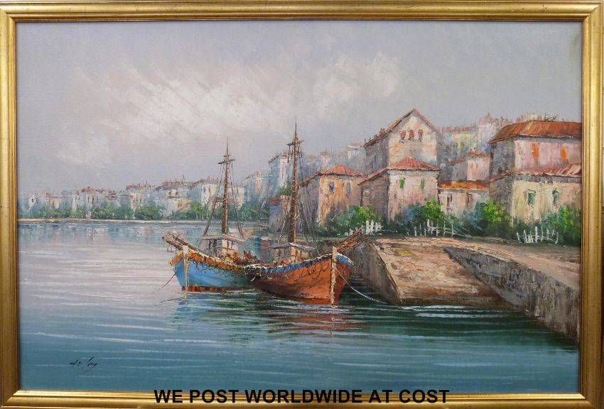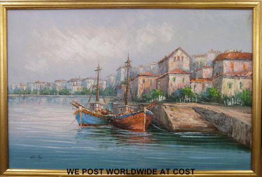 Acrylic on board of a harbour scene, signed lower left in a gilt frame, 61x92cm
