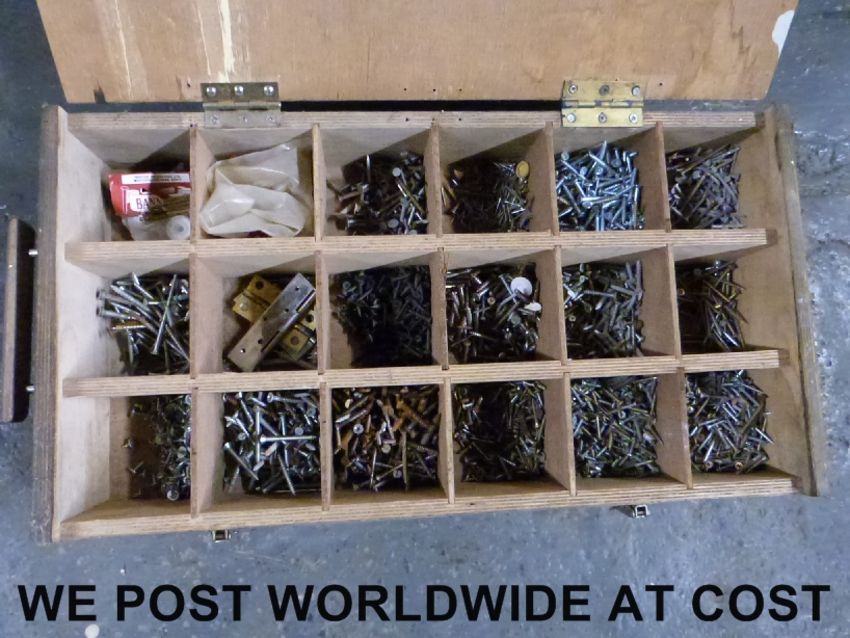 A garden trough, large wrench, shoe trees and a large collection of various size screws