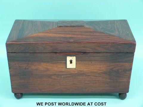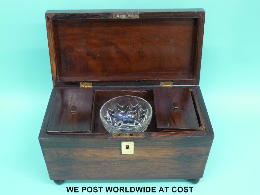 A rosewood or similar exotic wood tea caddy with two divisions flanking a mixing bowl (W30xD16xH18cm)