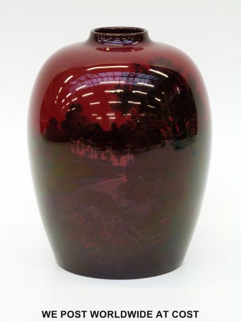 Royal Doulton flambe vase decorated with a cottage scene (19cm tall)