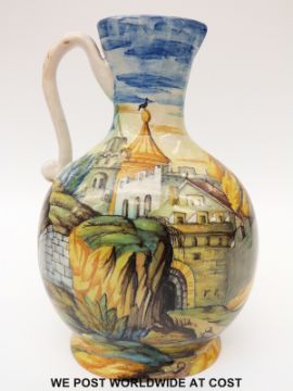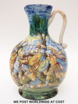 Cantagalli 19thC maiolica ewer in the urbino style with decoration of a battle scene (28cm tall)