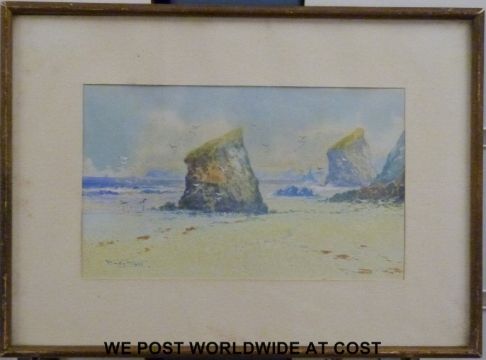 F.Leyton watercolour Bedruthan Steps, Cornwall (11.5 x 19cm)