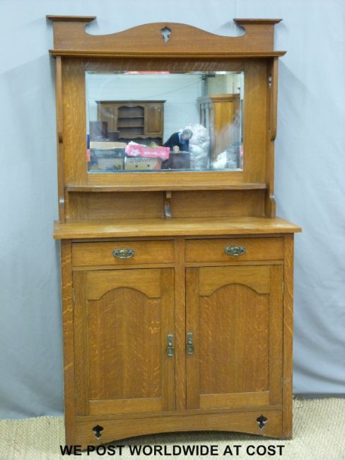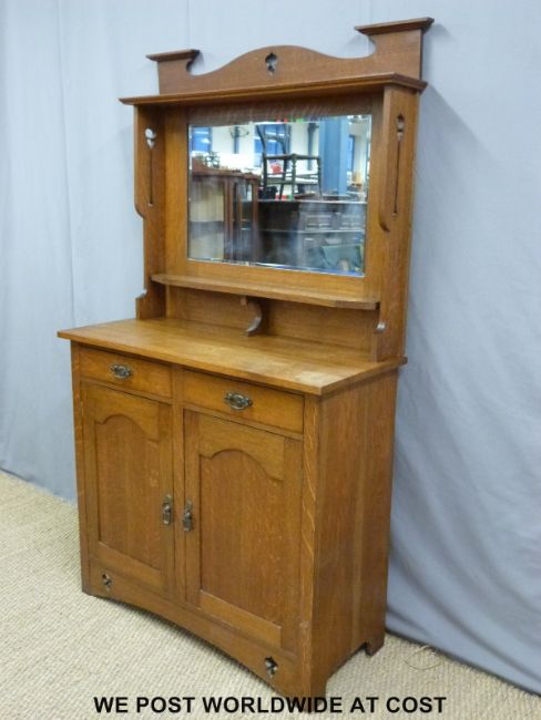 An Art Nouveau/Art and Crafts oak bevelled glass mirror back sideboard with pierced decoration (H191 x W107 x D47cm)