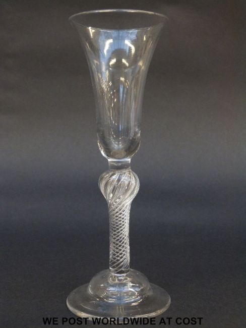 George II drinking glass with elongated bell bowl over multi-spiral air twist stem raised on domed foot, 18.4cm tall.