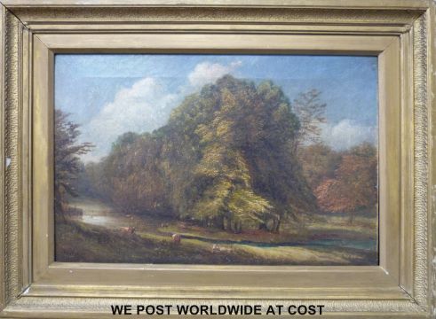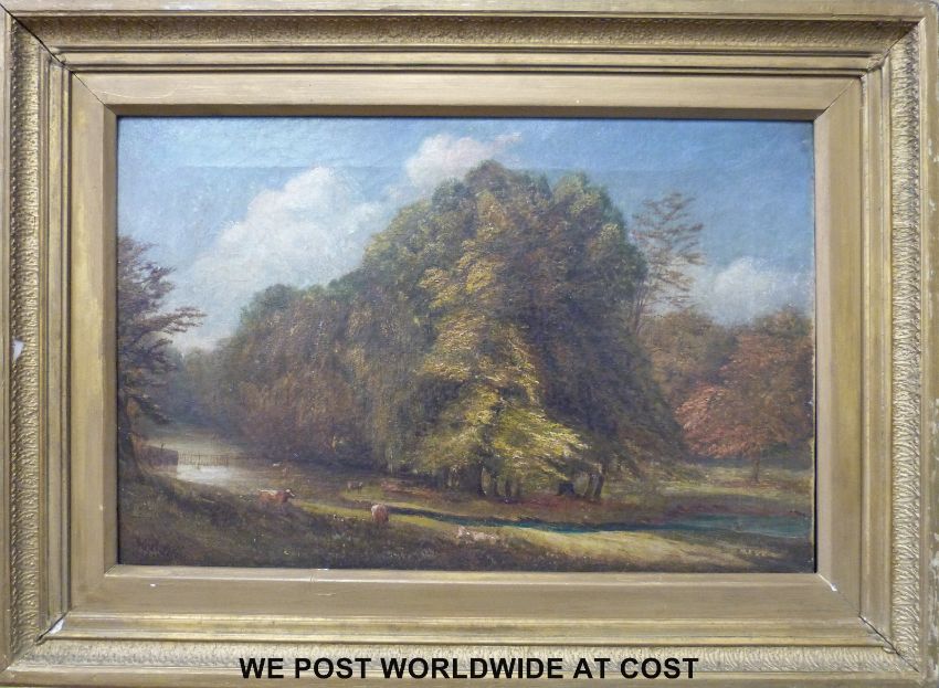 Hy Burrow oil on canvas landscape, cattle by a river, indistinctly signed lower left (29 x 45cm)